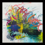 I layer graffiti-inspired lettering over my abstract work using acrylic paint and markers on canvas and hardboard panels. Inspired by street art, jazz for its improvisational qualities, and Abstract Expressionism.